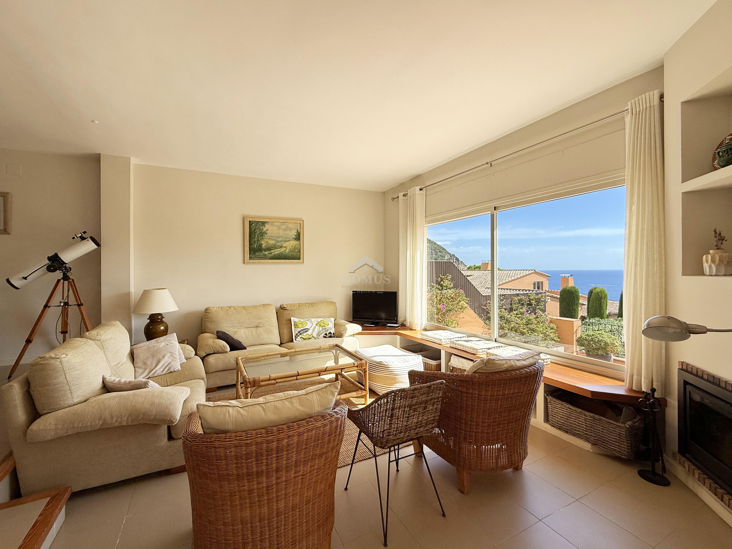 Planta principal: ampli saló-menjador amb llar de foc i sortida directa a gran terrassa amb vistes al mar, cuina independent amb accés a porxo i gran jardí ideal per menjars a l’aire lliure i un bany de cortesia.