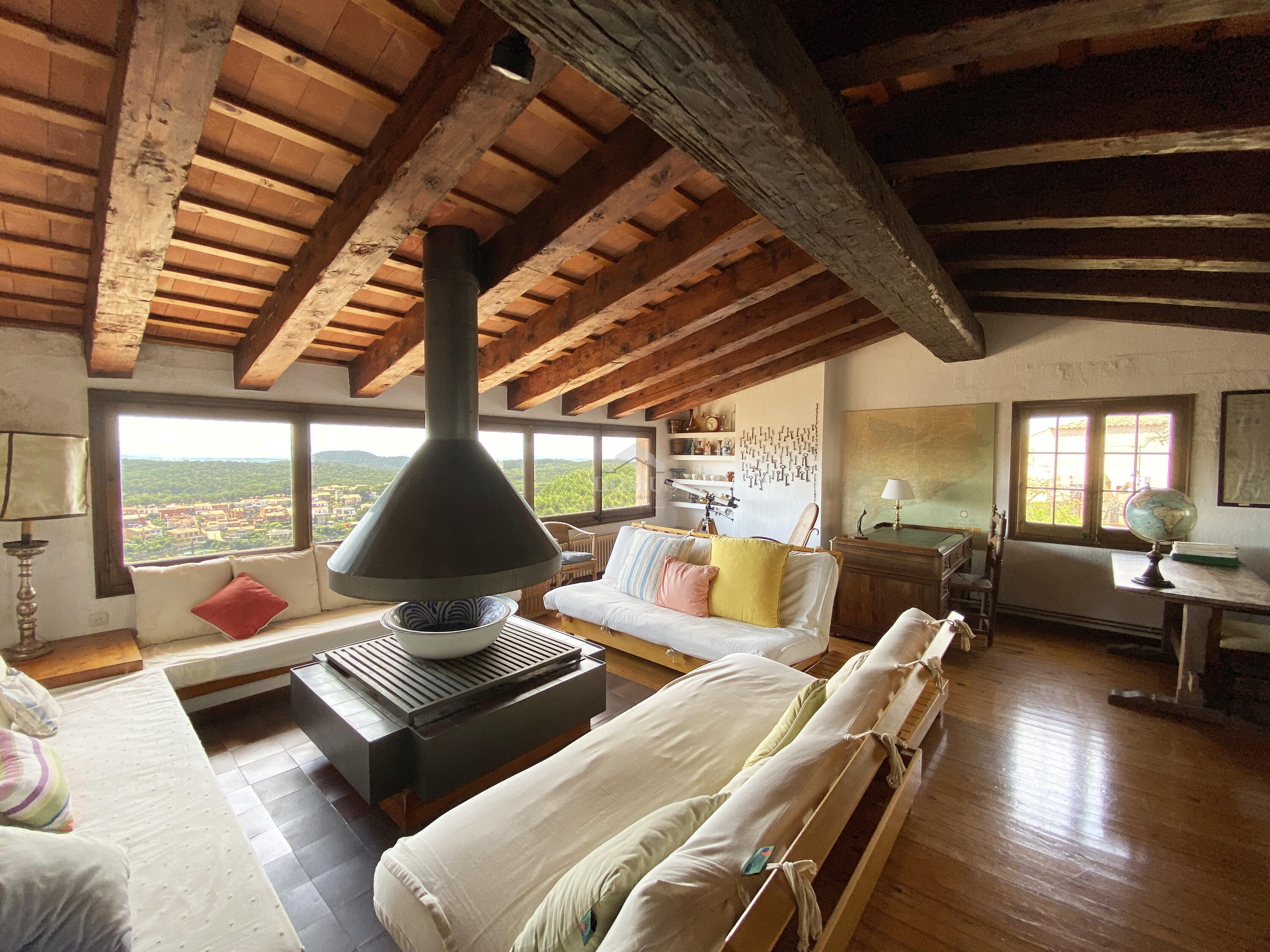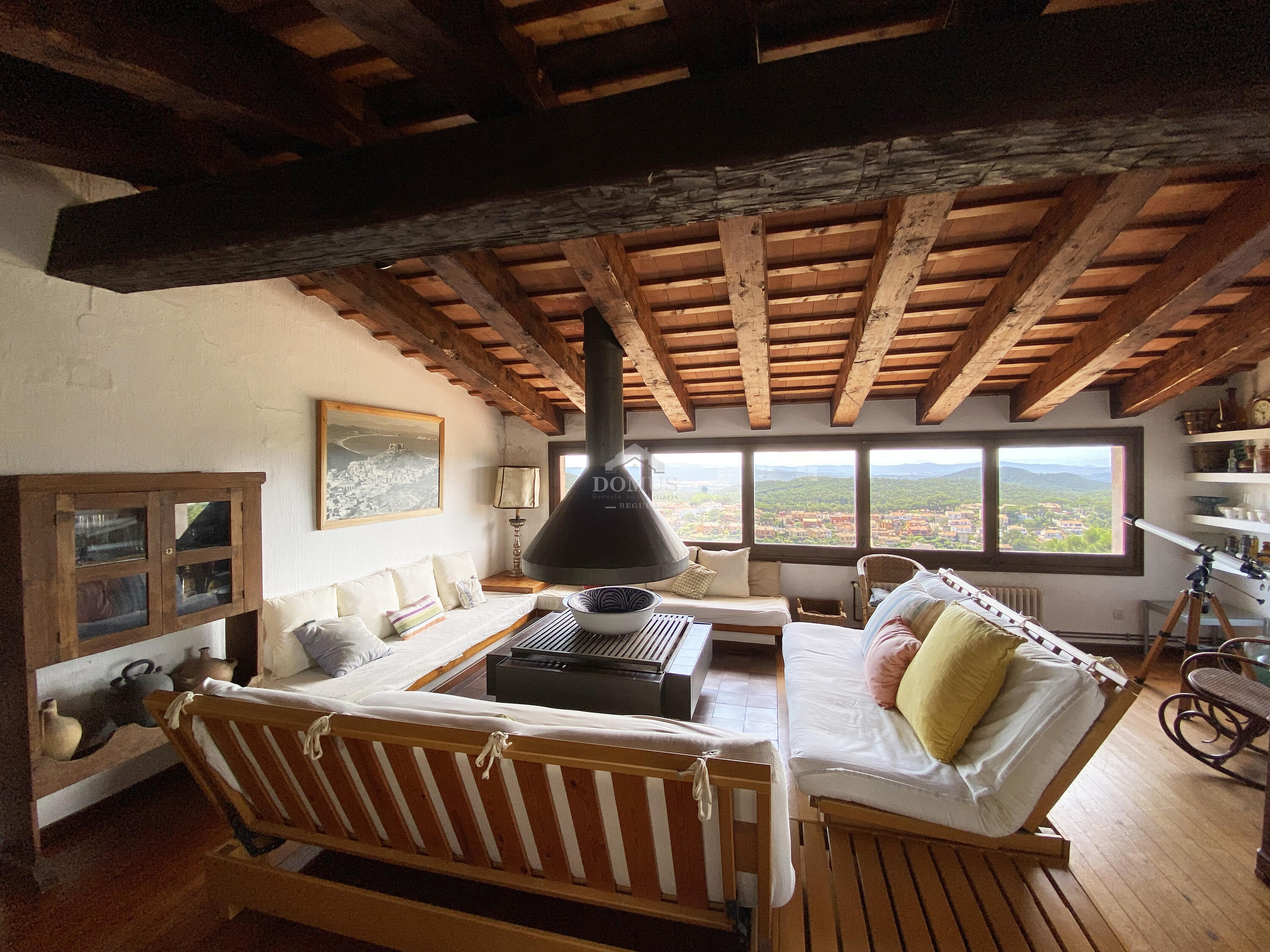 A la planta superior, una elegant sala de televisió amb llar de foc es converteix en un refugi ideal per relaxar-se, gaudint d’unes vistes espectaculars a les muntanyes i a l'entorn natural que envolta la casa.