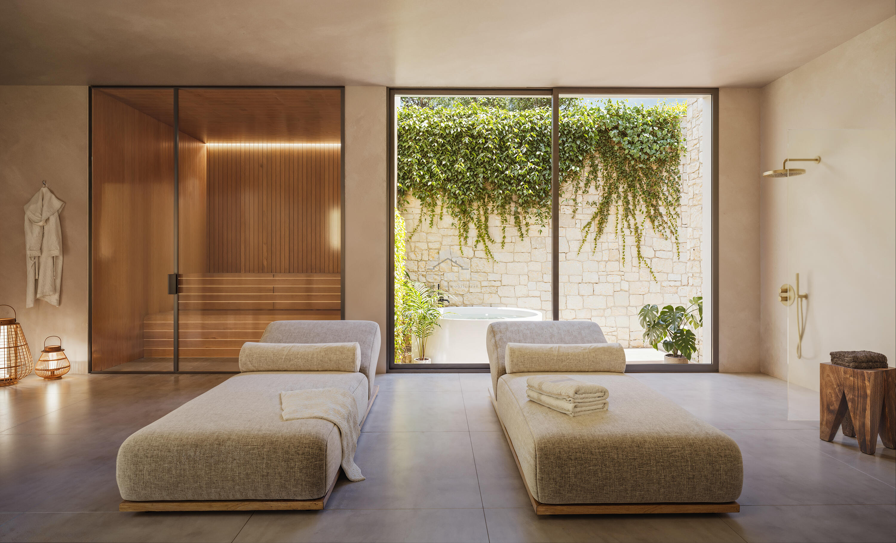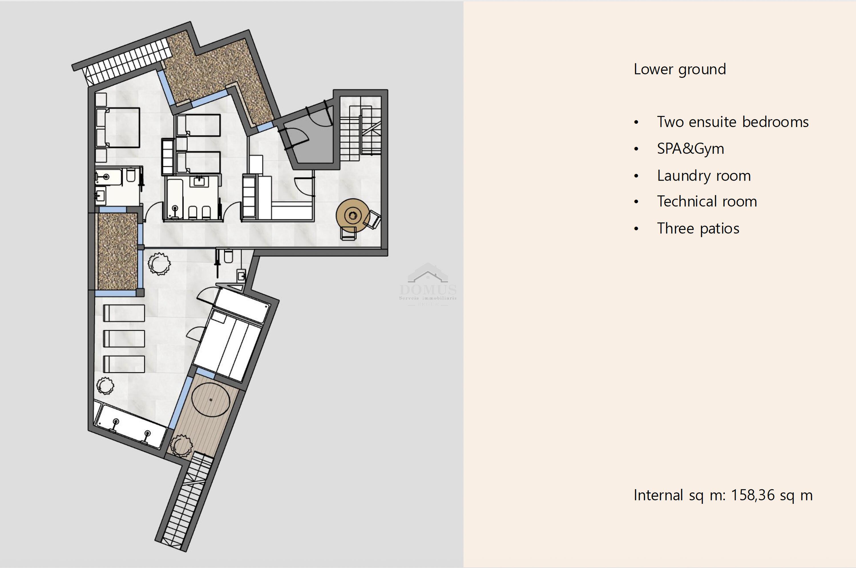 Planta inferior: pensada per al relax i la funcionalitat, amb un despatx amb sortida a un pati interior, un dormitori de servei, zona de benestar (gimnàs, sauna, jacuzzi) i sala de cinema. També hi ha espais d'emmagatzematge i bugaderia.