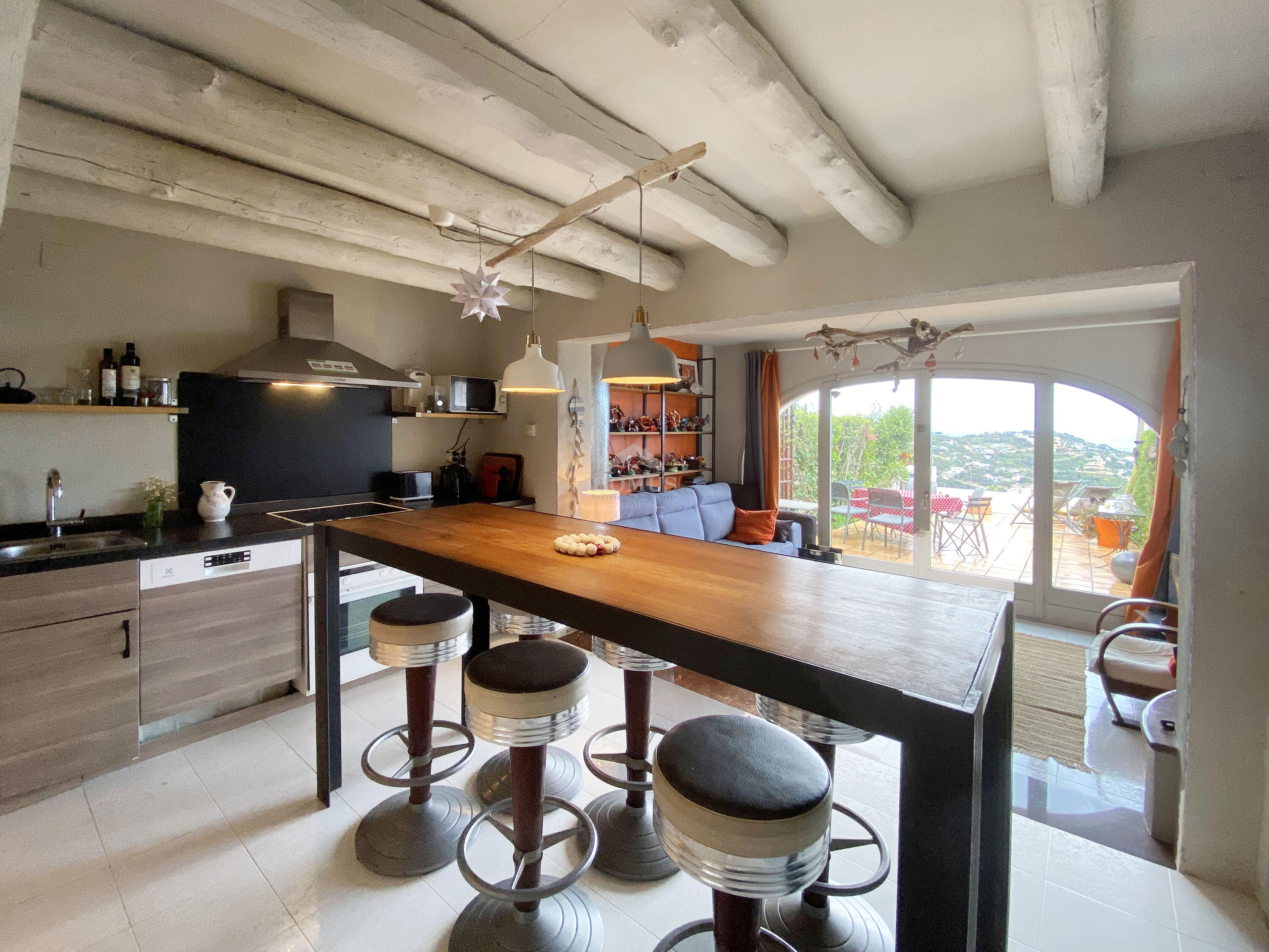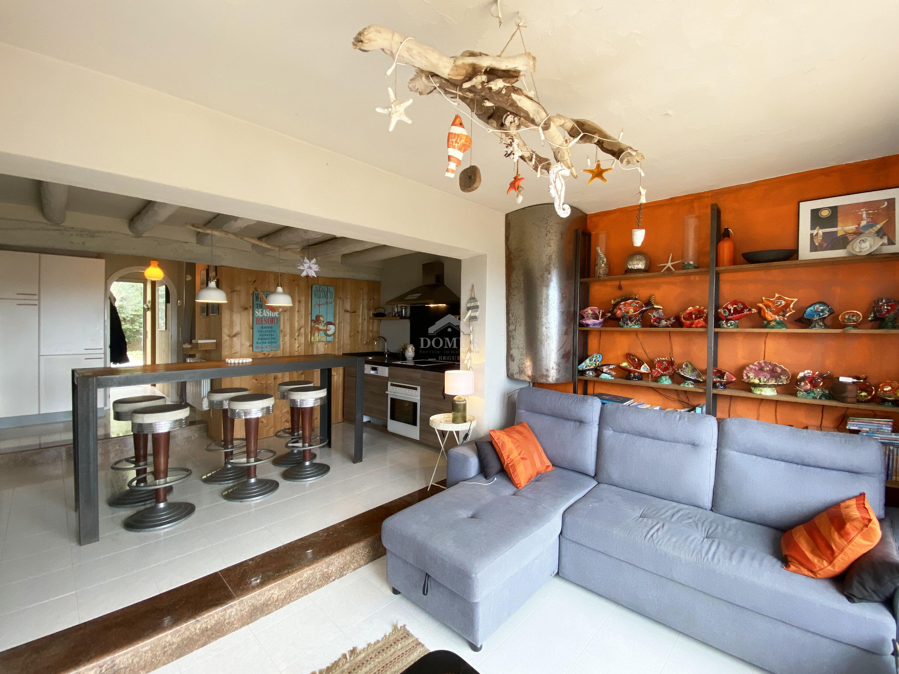 Le salon-salle à manger, spacieux et lumineux, s’ouvre sur une grande terrasse d’environ 25 m², parfaite pour se détendre, déjeuner en plein air ou prendre un verre en admirant la vue imprenable sur la mer. La terrasse comprend également un espace porche couvert, idéal à tout moment de la journée.