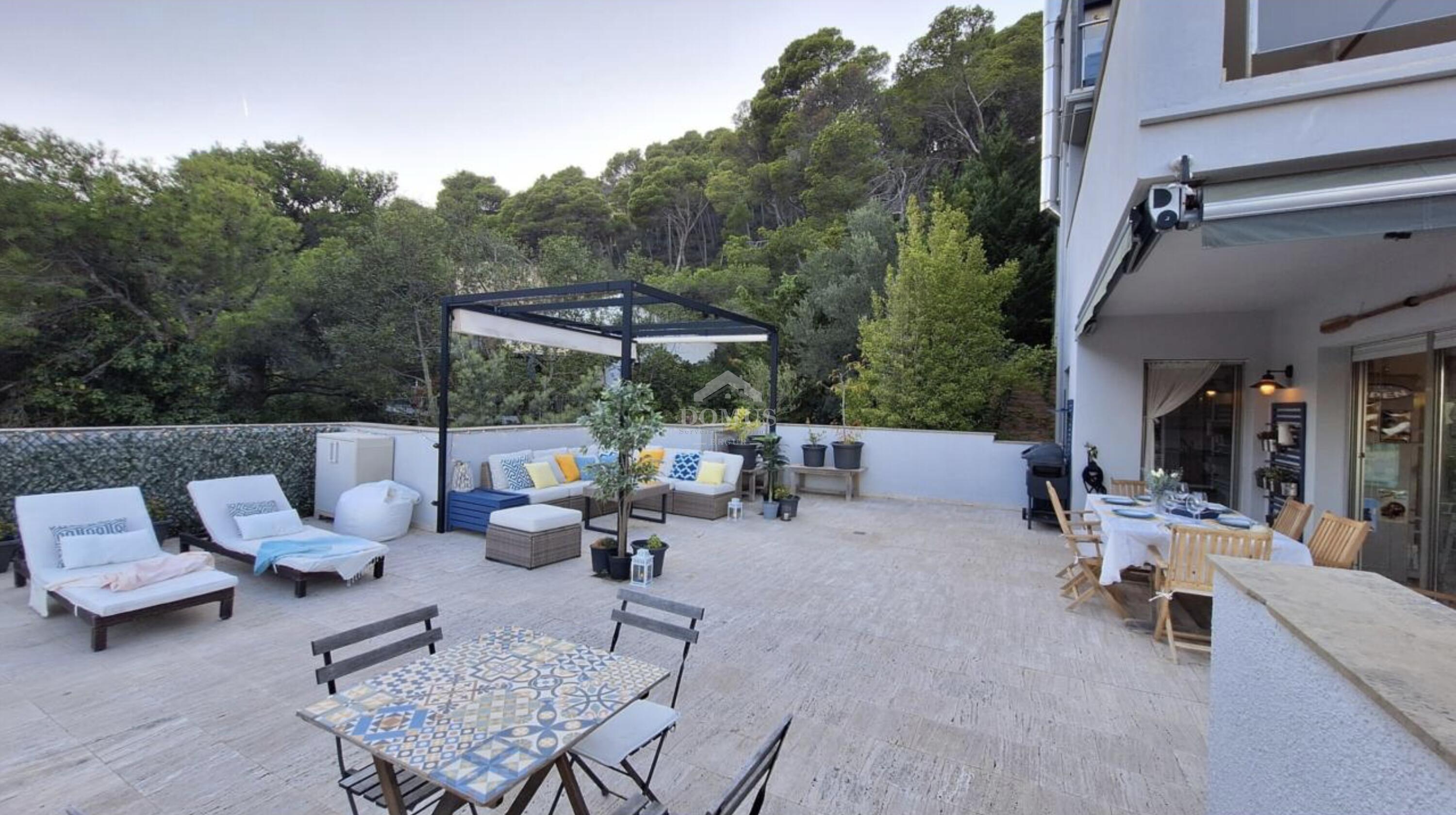 Buiten nodigt de woning uit om te genieten van het mediterrane leven met een aangename overdekte veranda, een verzorgde tuin met zwembad en zeezicht, zonneterras en een ruime parkeerzone met plaats voor twee auto’s.