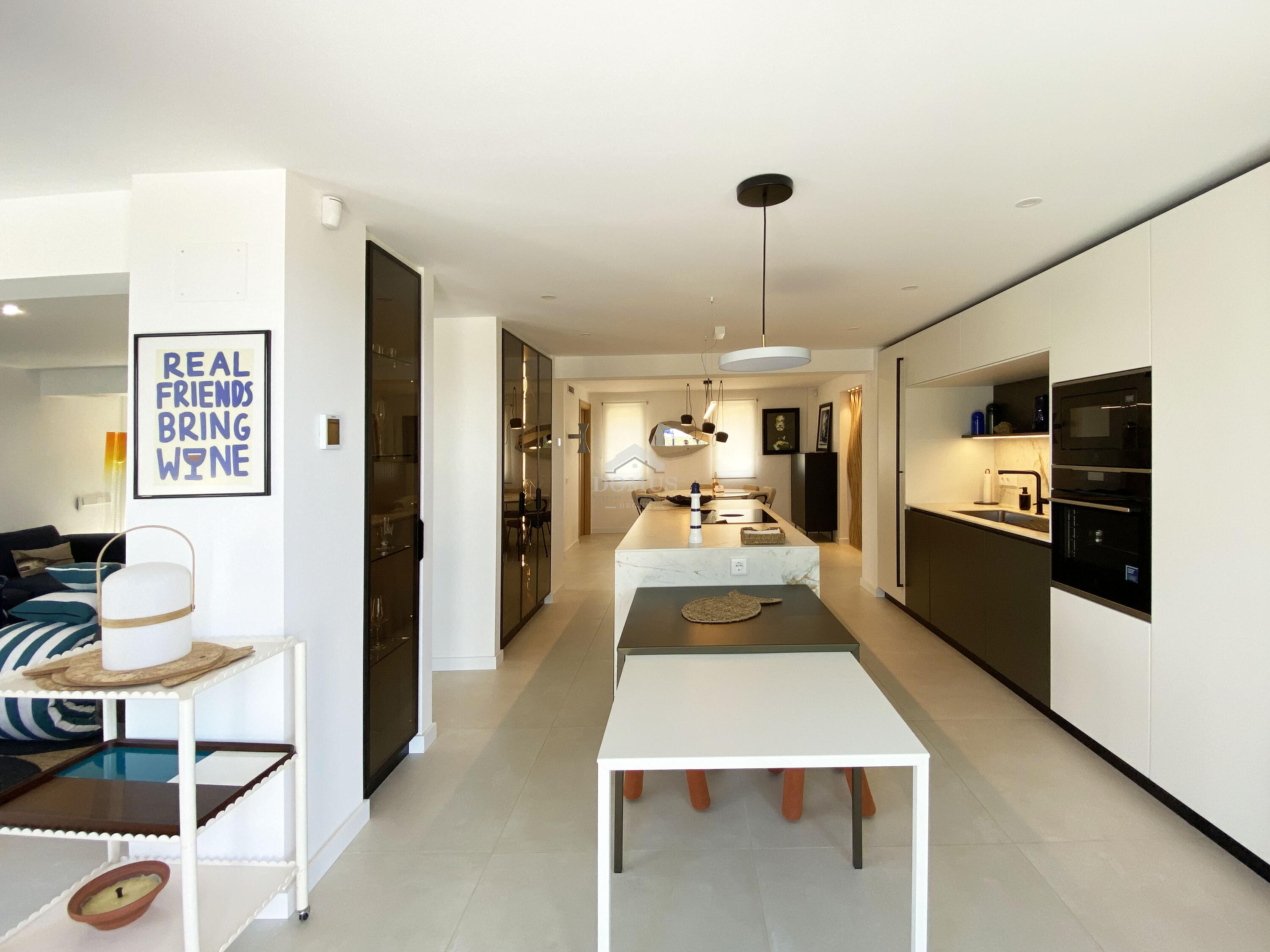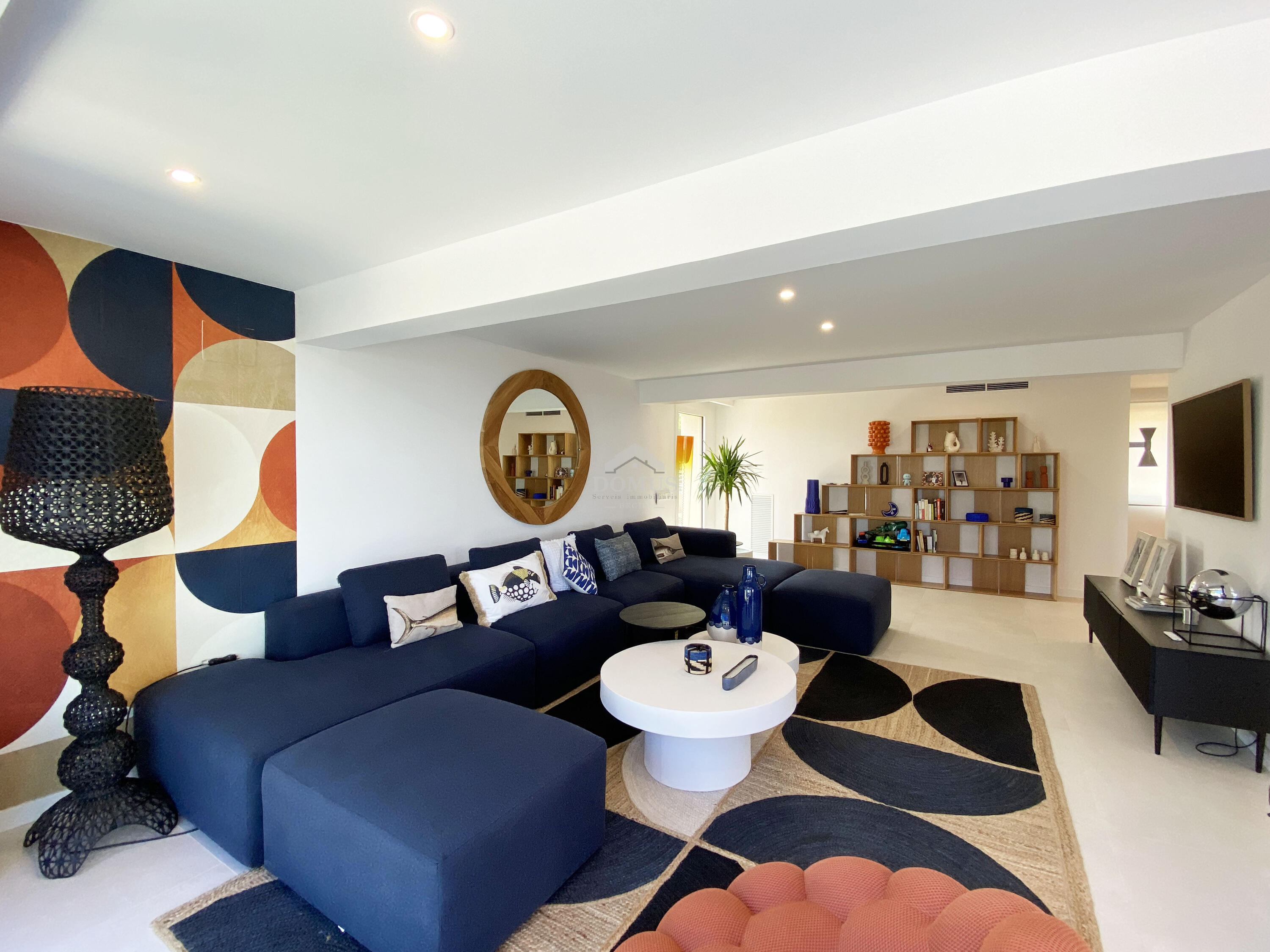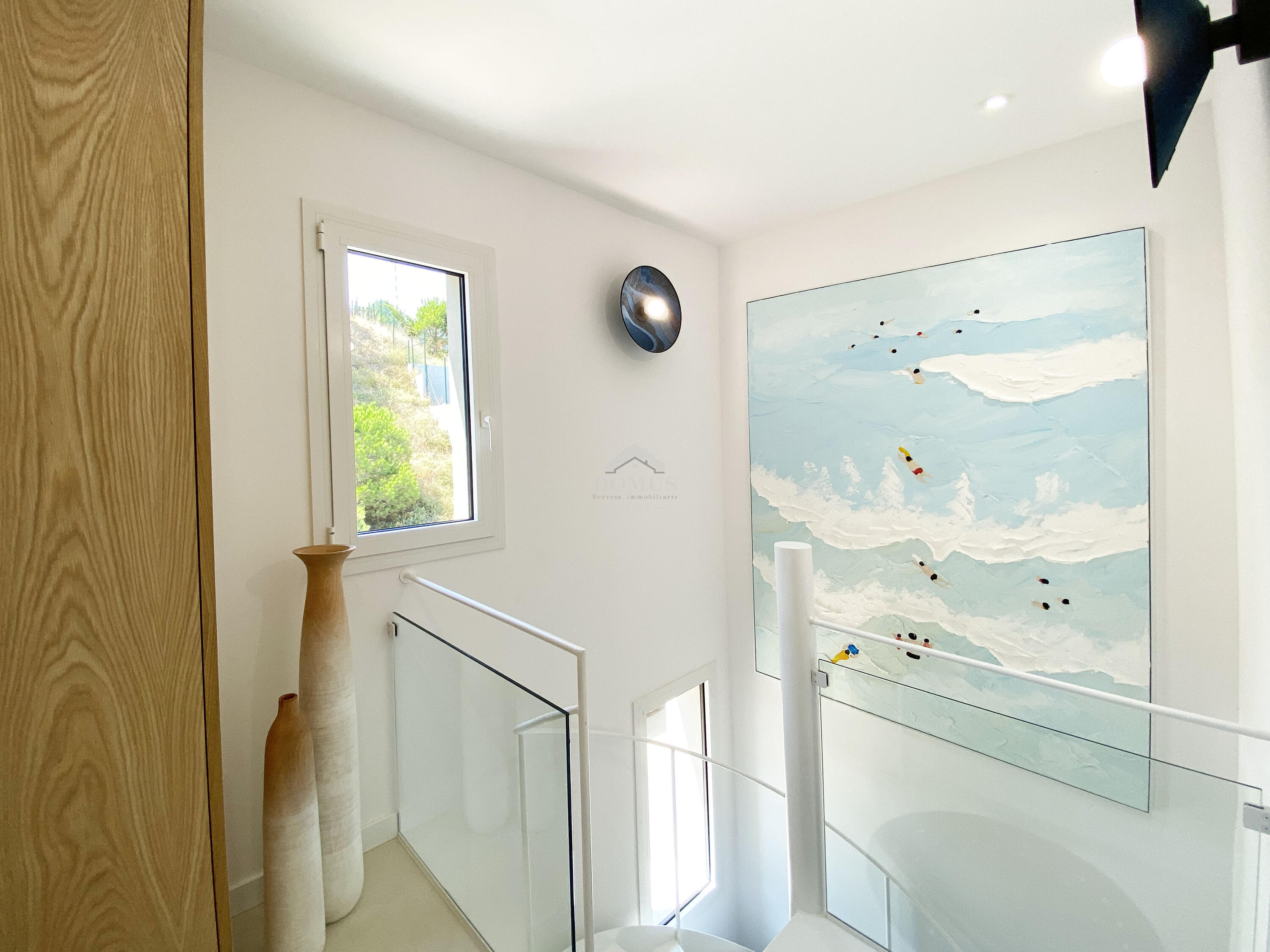 De woning is verdeeld over twee verdiepingen en biedt ruime, lichte leefruimtes. Op de hoofdverdieping bevindt zich een elegante woon-eetkamer met een volledig uitgeruste open keuken, die uitkomt op het terras met indrukwekkend zeezicht. Op deze verdieping vinden we ook een gastentoilet en een suite met eigen badkamer.